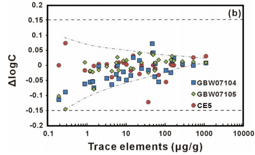 通过GenesisGEO点阵飞秒激光剥蚀电感耦合等离子体质谱(fsLA-ICPMS)方法分析得到的数据结果按照IGCP的标准进行检验,主量元素和微量元素的ΔlogC 值分别小于±0.05 和 小于±0.15,均符合严格的标准要求。这证明所提出的方法具有极高的准确性和可靠性。