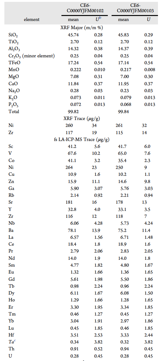X射线荧光光谱与点阵飞秒激光剥蚀电感耦合等离子体质谱(fsLA-ICPMS)联用技术,利用硼酸锂熔剂(67%Li2B4O7:33% LiBO2) (样品/助熔剂= 1:100) ,熔融样品制备的玻璃融片,对CE6月壤样品中的主量、微量和痕量元素进行分析。使用硼酸锂熔融的制样技术具有简单、高效、可靠以及与多种分析方法兼容等优点,因此在许多实验室中可成为首选的制样方法。融片能制备均匀的固体样品,并确保耐酸矿物的完全分解以及高场强元素的溶解(Ta, Hf, Nb, Zr)。这种样品制备方法有助于后续使用飞秒激光剥蚀电感耦合等离子体质谱法(fsLA-ICP-MS)进行元素的精确定量分析。该技术为相关领域的研究提供了有价值的指导,并有望应用于未来小行星和火星采样返回样品的分析。