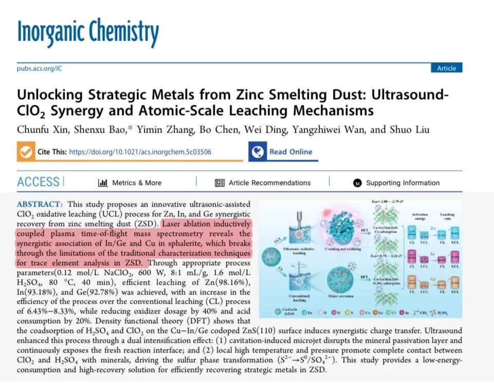 指导工艺设计:基于fsLA-ICP-TOF-MS结果,研究团队开发出超声辅助ClO₂氧化浸出(UCL)工艺,在低温、低酸、低氧化剂用量下实现Zn、In、Ge回收率均>92%。